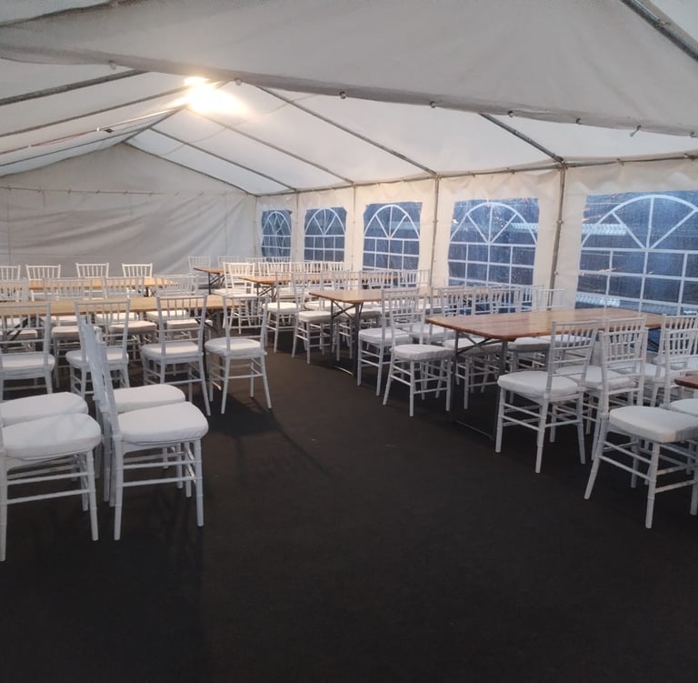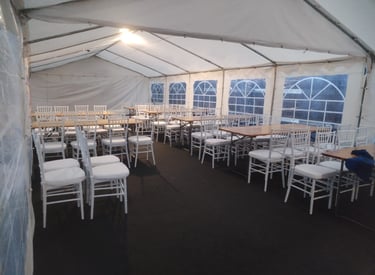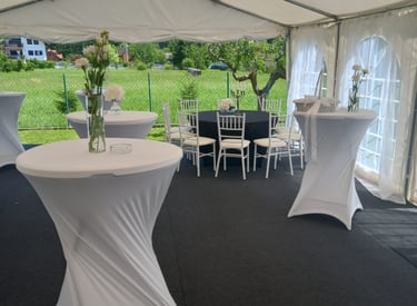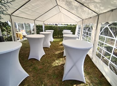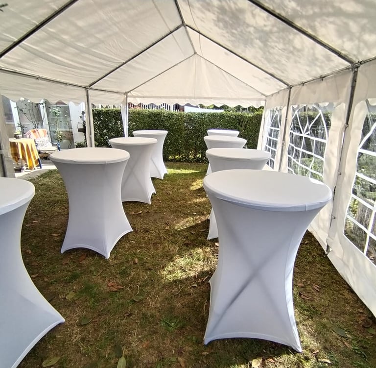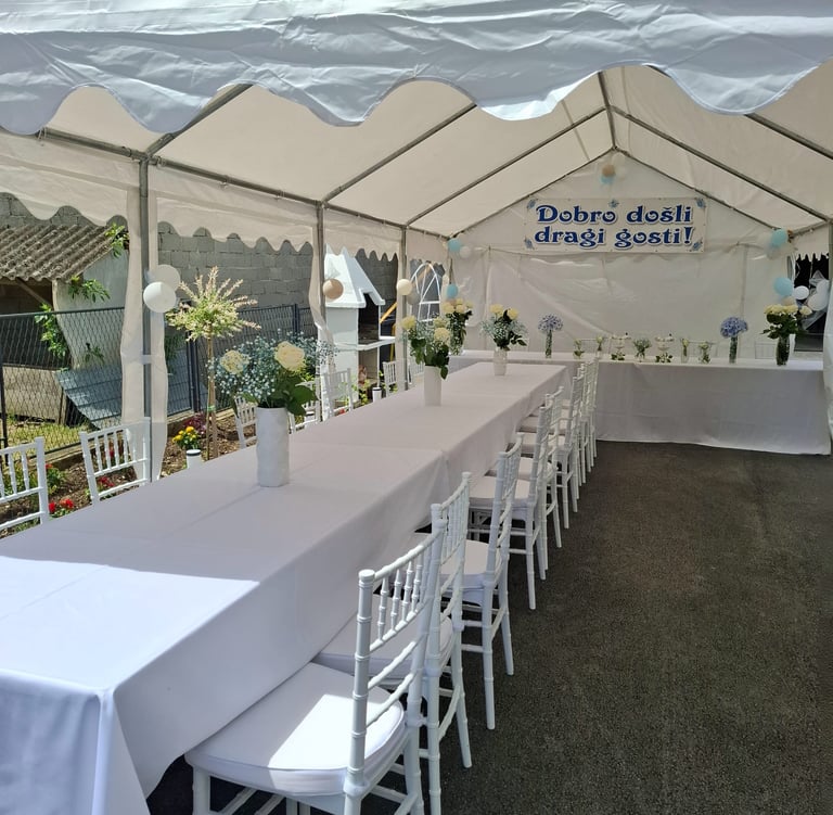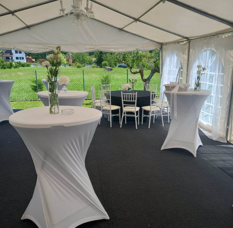 U navedeni šator stane između 8 do maksimalno 12 barskih stolova dimenzije fi 80x110cm za 48-60 stajaćih mjesta.