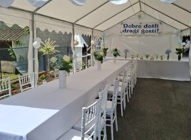 Šator je idealan za 40-48 sjedećih mjesta sa 5 do maksimalno 6 pivskih setova dimenzije 80x200cm.